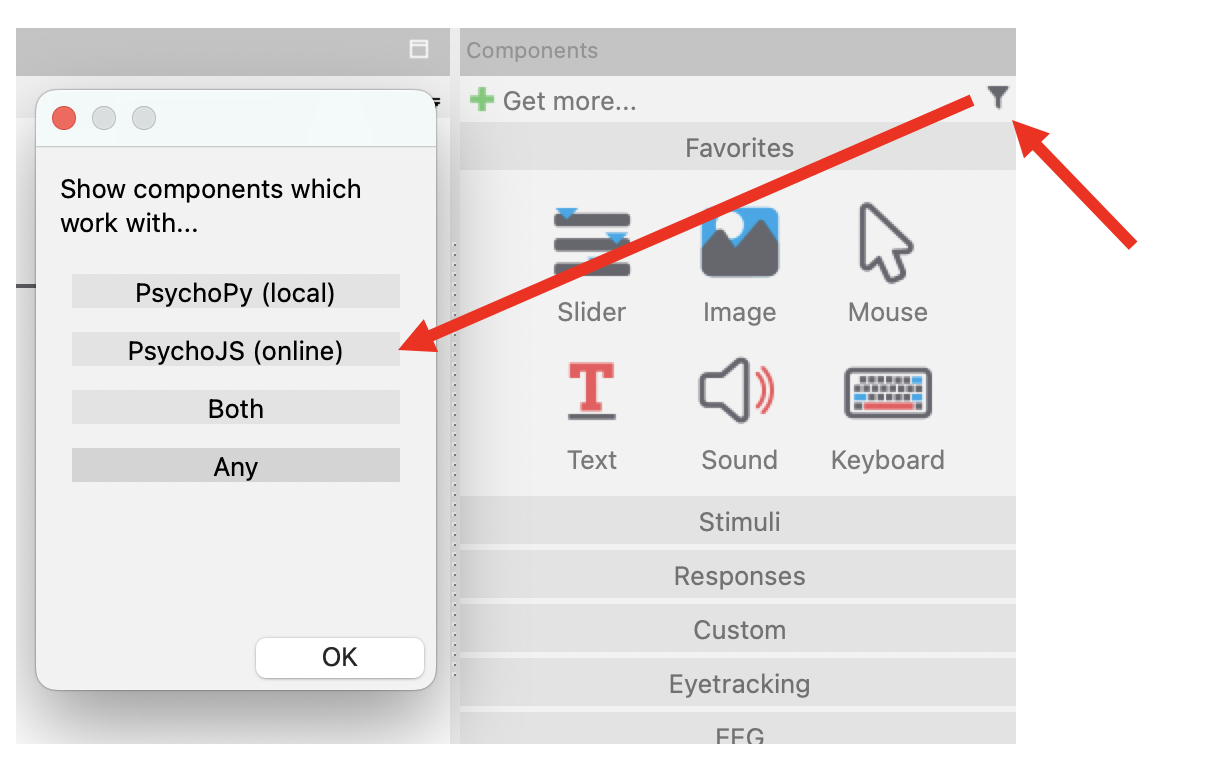 When creating your experiment in PsychoPy Builder, you can choose to selectively display components that will work online by selecting the filter icon next to “Get more” on your component panel and selecting PsychoJS (online).