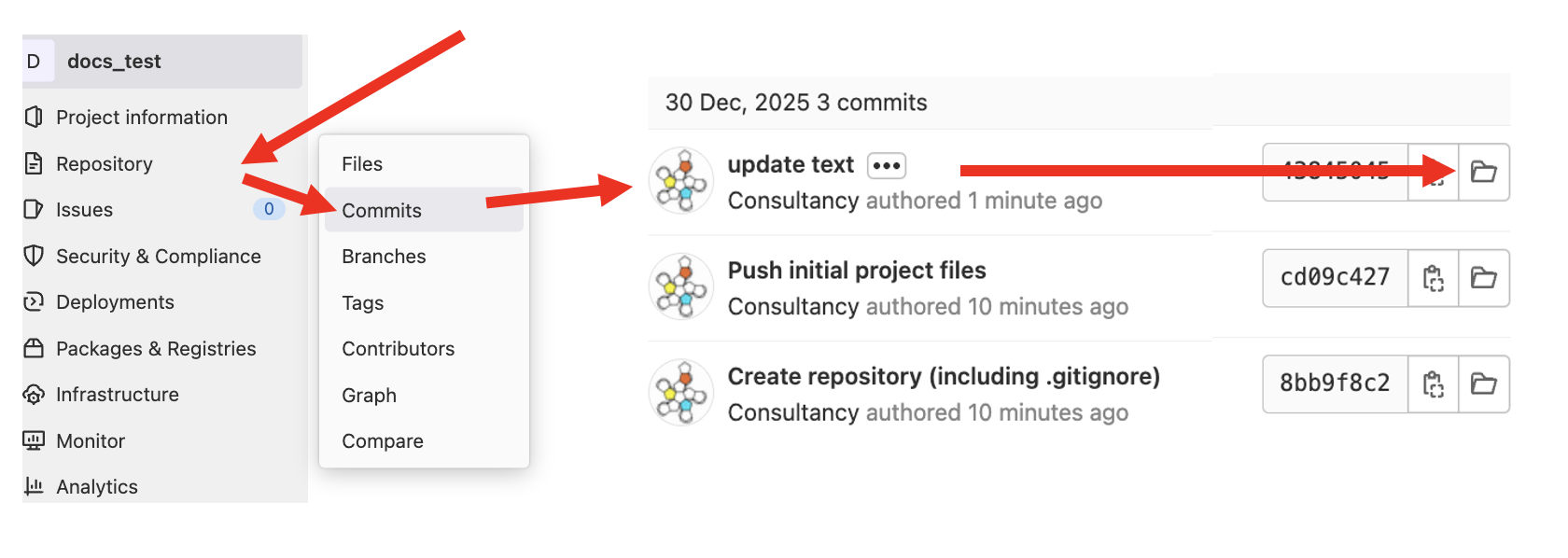 Fig. 20 Once you have selected “View Code”, navigate to the “Commits” tab to see the version history of your experiment.¶